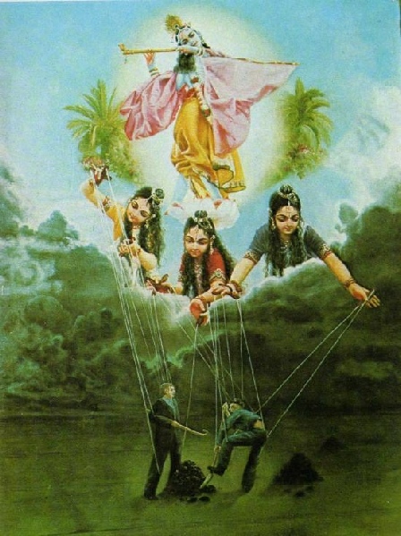 Il problema nasce dal cercare la gratificazione in un modo sbagliato. Così, l’anima inizia il suo viaggio verso l’universo materiale, dove la sua coscienza è influenzata da concetti materialisti fino ad accrescere di conseguenza una erronea identificazione del proprio essere, sia a livello grossolano che di quello sottile. Aria, etere, fuoco, acqua e terra sono gli elementi del corpo grossolano; mentre falso ego, intelligenza e mente sono le componenti del corpo sottile. La combinazione tra il corpo grossolano e il corpo sottile rappresenta la base di tutti gli esseri viventi. La coscienza dell’anima contaminata identificandosi ormai con un certo tipo di ego si allontana dalla vera e originale natura, quella Spirituale, e con le sue scelte non fa altro che coprire le sue originali qualità trascendentali.